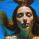 "Selene" - Frauen im Wasser. In dieser ruhigen, farbenfrohen, schönen Kunst Frauen Wasser-Szene, eine schöne Frau mit langen roten Haaren schweben in einem blauen wirbelnden Meer. Sonnenlicht verdampft ihr friedliches Gesicht unter der Wasseroberfläche. Mit geschlossenen Augen und gehobenem Gesicht nimmt sie das Licht auf und verkörpert eine starke, widerstandsfähige und inspirierend Figur in diesem mehrfarbigen Bild.