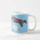 illustriertes Bucht Selle Francais Pferd, das über einen Sprung springt. hellblauer Hintergrund, Text sagt "Selle Francais" 3mal im Schwarzen und im Braun.