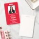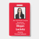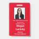 Seminar Abzeichen in Rot und Weiß. Alle Elemente können geändert werden, inklusive: Foto, Seminarname, Seminarort & Termin, Teilnehmername, Teilnehmertitel und Firmenname. Auch in horizontaler Ausrichtung in diesem Shop erhältlich. Stecken Sie oben für den Lanyard.
