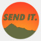 Orange and Army Green Sticker with Send it and a mountain landscape on it.