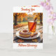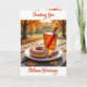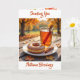 A pretty Fall card to send someone Autumn Blessings. A pretty illustration of plate of a glazed donut, apple cider with cinnamon stickrs and a pretty Fall leaves background.