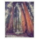 Das Bild zeigt einen flachen Blick auf die mächtigen Sequoia-Bäume in einer Waldlandschaft. Die Bäume haben dicke, rötlich-braune Rinde und dehnen sich hoch in den Himmel. Schnee staubt den Boden leicht und kleinere immergrüne Bäume im Hintergrund. Der Himmel ist bedeckt und erzeugt ein weiches, diffuses Licht. Die Stimmung ist insgesamt ruhig und majestätisch, was die immense Größe und das Alter der Bäume unterstreicht.