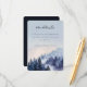 This wedding enclosure card features a serene watercolor-style illustration of a misty forest landscape, creating a tranquil and ethereal atmosphere. The design showcases tall pine trees in varying shades of blue and green against a soft gradient sky transitioning from light to medium blue. Elegant script typography highlights the main heading "the details," while clean serif fonts provide additional information, ensuring readability and sophistication. Perfect for couples seeking a nature-inspired aesthetic, this card sets a calm and inviting tone for their special day.