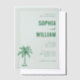 This elegant wedding invitation features a minimalist design with a soft mint green background, creating a serene and sophisticated atmosphere. The layout is centered, showcasing the names in bold uppercase letters with a cursive "and" adding a touch of elegance, while a stylized palm tree illustration introduces a tropical theme. The typography combines serif and script fonts for subtle variety, ensuring clarity and grace. Perfect for couples seeking a clean, modern aesthetic that emphasizes legibility and charm, this invitation sets the tone for a memorable celebration.
