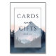 This is a minimalist style image featuring a tranquil mountain landscape at dawn or dusk, with soft pastel hues blending into the sky. The text "Cards and Gifts thank you" is elegantly centered within a framed rectangle, adding a touch of sophistication to the serene backdrop. The composition evokes feelings of calmness and gratitude, making it perfect for expressing heartfelt thanks in a stylish yet understated manner.