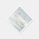 This wedding napkin design features a serene coastal scene with soft pastel colors, including light blues, grays, and hints of pink and white. The watercolor style creates a dreamy, ethereal quality, showcasing gentle waves crashing against rocky shores and a prominent red and white striped lighthouse. Elegant cursive typography is centrally positioned above the lighthouse, while customizable placeholder text allows for personalization. The overall mood is calm and romantic, perfect for adding a touch of tranquility to your special day.