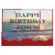 Stellen Sie sich eine Leinwand vor, die mit dem ruhigen Sonnenuntergang über dem Ozean bemalt wurde, mit dem herzlichen Gruß "Glücklicher Geburtstag Jesus" geschmückt und mit Weihnachtsbäumen geschmückt ist, die sich auf einer Reihe roter Hügel auf der Basis des Designs ruhen.