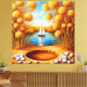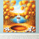 Lebhaftes Kunstwerk mit einem ruhigen Sonnenuntergang, einem Segelboot, das auf einem ruhigen Wasser, goldenen Bäumen und einem landschaftlichen Ambiente mit warmen Farben und harmonischer Komposition reflektiert und Ruhe und Entspannung schafft.