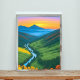 Dieses ruhige Gemälde besticht durch die Ruhe eines gewundenen Flusses, der sich durch ein grünes Tal schlängelt. In den warmen Farbtönen der untergehenden Sonne strahlt die Szene ein Gefühl von Ruhe und Entspannung aus. Am Ufer liegen üppige Bäume, ihre Blätter verfärben sich mit Herbstfarben, während schneebedeckte Gipfel majestätisch in der Ferne steigen. Dieses exquisite Kunstwerk ist ein Fest der Schönheit der Natur und eine perfekte Ergänzung zu jedem Zuhause.
