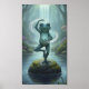 This whimsical poster features a frog balanced in a yoga pose on a mossy rock amid a misty forest pool, glowing waterfall backdrop and magical light-serene, fairytale nature scene.