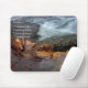 Foto einer fließenden Bucht mit Blätter aus Ahorn und Eiche im Vordergrund, auf einem hochwertigen Mousepad dargestellt. Die folgenden Wörter werden auf dem Mousepad angezeigt: "Stille ist ... Herbstfarbe, brüchige Bäche, Düfte von Wäldern, singende Vögel".