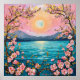 Die ruhige Landschaft wird durch lebhafte Farben und aufwändige Details unterstrichen. In der Mitte leuchtet ein Vollmond sanft gegen einen pastellfarbenen Himmel und wechselt von Rosa zu Pfirsich. Flankieren Sie den Mond durch die weit entfernten Berge, die der Szene noch mehr Tiefe verleihen. Im Vordergrund bilden blühende Kirschbäume mit zarten rosa Blume das Bild, ihre Äste kurbeln anmutig. Das Wasser unter dem Himmel spiegelt die ruhige Stimmung wider, während goldene Akzente, die möglicherweise das Sonnenlicht darstellen, eine Touch von Wärme und Helligkeit hinzufügen. Insgesamt erinnert das Bild an ein Gefühl von Ruhe und natürlicher Schönheit.