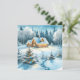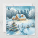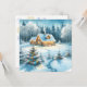 Personalisierte Weihnachtskarte. Hübsche festliche Blockhütte mit Weihnachtsbeleuchtung und schönem schneebedeckten Baumbestand.