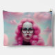 Ein von der KI generiertes Bild eines Mädchens mit rosa, cremefarbenen, cremefarbenen und von rosa Wolken mit Baumwollbonbons umgebenen. Ideal für ein zwischen- oder Jugendzimmer.