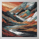 Eine surreale bergige Landschaft mit einem gewundenen Fluss unter einem orangen Himmel, mit Felsen in erdigen, weißen und bläulichen Tönen und einer reichen, lebendigen Farbpalette.