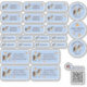 Hübsche wasserfeste Namensaufkleber für Mädchen. Set mit 24 verschiedenen eckigen und runden Namensaufklebern, Motiv Pony und Schmetterlinge auf blauen Sternchen-Hintergrund.