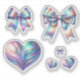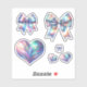 Dieses elegante Vinyl-Aufkleber-Set zeigt rieszierende Bögen und Herzen in verschiedenen Größen mit schimmernden Regenbogenfarben und leuchtenden Qualitäten. Der stilistische, bugthematisch gestaltete Aufkleber und das Herzmotiv fügen dem Inhalt, den Sie hinzufügen, eine Touch Flair hinzu.