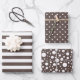 Drei Muster in kaffeebraun und weiß: einfache Streifen, Polka-Punkte und zufällige Flecken.