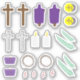 Ein Set von Symbolklebeln, darunter zwei Holzkreuze, zwei überdachte Holzkreuze mit lila Tuch, zwei weiße, moderne Kreuze, zwei kleine brennende Votivkerzen, zwei kleine brennende Teelampen in lila Hälften, zwei Dornkronen, zwei Sonnen- und Mondsymbolen mit 40, um Jesu 40-tägige Schnelligkeit in der Wildnis zu repräsentieren, zwei Sets von Palmfronten und vier Sets Blutstropfen. Ideal für Lent and Oaster craft Projekte.