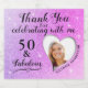 Kreieren Sie personalisierte, purpurfarbene Rosa Dankeschön für die 50. Geburtstagsfeier mit schwarzer Typografie und individuellem Foto. Das glamouröse Vorlagendesign zeichnet sich durch ein herzförmiges Foto in einem silbergrauen Rahmen, den Namen der Geburtstagsfrau und den fünfzigsten Meilenstein aus. Sie können den Meilenstein auf den 30., 40., 60. oder andere Jahre mit der Vorlage ändern.