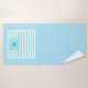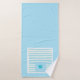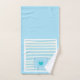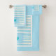 Set tre asciugamani bagno, fondo celeste con disegno rechts e logo appartamento per vacanze.
