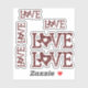 Beängstigende Western-Schrift des Wortes "LIEBE" mit dem "O" ersetzt durch den Staat von Texas mit einem Herz aus ihm geschnitten. Erhältlich in U T Longhorns verbrannt orange, Texas A & M Aggies maroon, Tech Raiders rot, schwarz, Staatsflagge blau, Kakteen grün und Periwinkle lila. Auf dem extra kleinen Blatt ist der große Aufkleber etwa 2" breit, die kleinen Aufkleber 1" breit.