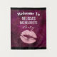 Junggeselinnen-Abschied Tapisserie mit trendigen rosa Imitate und Glitzer Lippen. Der Hintergrund ist ein dunkelrötlich-rosa Muster mit tropischen Blätter aus Palmen.
