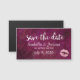 Magnetisch Save the Date mit trendig rosa Imitate-Glitzer Lippen. Der Hintergrund ist ein dunkelrötlich-rosa Muster mit tropischen Blätter aus Palmen.