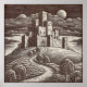 Hochwertige Grafik eines Graffito-Kunstbildes eines Schlosses, gerendert mit aufwändigen, gravierten Linien, die die Textur des Steines und den dramatischen, stilisierten Himmel einfangen. Die monochrome Palette verleiht ihr den klassischen Look einer detaillierten, antiken Illustration.