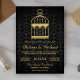 Erleben Sie Ihre Gäste mit dieser eleganten Hochzeitseinladung mit einem schönen goldenen Vogelkäfig vor schwarzem Damast. Fügen Sie einfach Ihre Veranstaltungsdetails zu dieser einfach zu bedienenden Vorlage hinzu, um sie zu einer einmaligen Einladung zu machen. Dreh die Karte auf, um eine goldene Glitzer-Textur des Imitats auf der Kartenrückseite sichtbar zu machen.