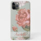 Zeitgenössisches hübsches Weiß und Rosa Rosen Blumenmuster auf einem hellgrünen Hintergrund. Mit Raum zum Anpassen oder Personalisieren mit einem Namen, Monogramm oder Initialen Ihrer Wahl. Schönes, elegantes und stilvolles Cover für den Trend-erfahrenen und kunstliebenden angesagten Trendsetter, künstlerischer Motif-Liebhaber, der will, ihr Handy vor Staub und Schmutz, Abnutzung und Tränen zu schützen. Dieses Design ist erhältlich in Apple iPhone 6, 7, 8, 10 oder X, XR, XS, 11, 12, 13 Mini, 14, 15 Plus, und Pro Max Handy Hüllen. Zeigen Sie Ihren Stil, sehen Sie modern aus und fühlen Sie sich stilvoll mit einem einzigartigen Design auf einem mobilen Zubehör Ihrer Wahl.