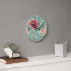 This clock features a shabby chic design of pink and white florals on a teal background.