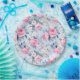 Ästhetisches Shabby Chic pastellrosa Rosen und weiße Blume in einem nahtlosen Muster mit hellblauem Hintergrund.
