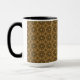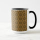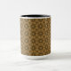Diese Tasse weist ein abstrakt wiederholtes Fliesenmuster in den Farben Gold und Braun auf.