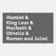 Ein atemporales Design, perfekt für alle, die englische Literatur Lieben! "Hamlet und König Lear und Macbeth und Othello und Romeo und Julia" Shakespeare spielt auf grauem Hintergrund. Viktorianische Literatur. Akzentuieren Sie Ihren Stil und Raum mit dieser Kunst.