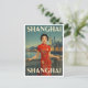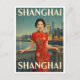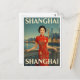 Step into the vibrant nightlife of Shanghai with this exquisite vintage travel poster style postcard. It features a graceful woman in a traditional red cheongsam (qipao), adorned with delicate floral patterns, standing by the Bund waterfront. In the background, the iconic Shanghai skyline lights up, showcasing landmarks like the Oriental Pearl TV Tower and modern skyscrapers against a twilight sky. Perfect for celebrating Chinese culture, decorating with retro Asian art, or sending a stylish greeting from this dynamic city. A wonderful piece for collectors of vintage travel art and lovers of classic Shanghai glamour.