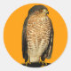 Auf diesem Aufkleber befindet sich ein Sharp-Shinned Hawk, der oben auf einem Vogelfutter steht und eine Mahlzeit hofft. Er starrt einen Jäger. Seine gelben Talone und orangefarbenen Augen sind prominent. Er hat schöne Rost und Creme Bands auf seiner Brust, weiße und schwarz gestreifte Schwanz Federn, und einen grauen Rücken. Die Beute dieses Habichts sind meistens kleine Vögel. Obwohl der "Sharpie" der kleinste Falken Nordamerikas ist, ist er ein sehr heftiger Raubtier. Sobald ich dieses Foto genommen hatte, jagte ich ihn von unseren Federn weg!