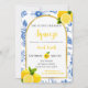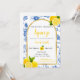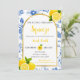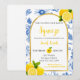She Found Her Main Squeeze bridal shower invitation features blue flowers, yellow lemons, and black-and-yellow text.