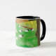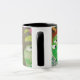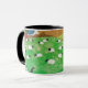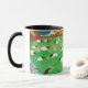 Eine weiße Tasse mit schwarzem Griff und Felge und eine handbemalte Papierkollektion von Schafen.