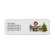 Desteis originelle Cartoon-Illustration eines niedlichen eingängigen Schäferhundes / Sheltie Rasse Hund. Neben dem Hund gibt es einen personalisierbaren Textbereich. Der Hund ist in einem festlichen Wohnzimmer mit Kamin untergebracht. Der Kamin ist eingeschaltet und hat zwei rote Strümpfe an der Seite. Auf dem Kamin befindet sich ein grüner Kranz, der mit einem roten Bogen und gelben Kreisen als Lichter dekoriert ist. Auf dem Mantel stehen drei kleine Dreiecksbäume, die ebenfalls mit gelben Kreisen als Lichter geschmückt sind. Auf dem Mantel befinden sich auch zwei beige Kerzen. Neben dem Kamin befindet sich ein festlich grüner Weihnachtsbaum mit zwei Geschenken. Der Weihnachtsbaum ist mit roten und gelben runden Ornamenten und einer grauen Garage dekoriert. Auf dem Baum ist ein gelber Stern.