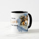 "Sheltie Kisses reparieren alles" erklärt diese niedliche Tasse für den Shetland Sheepdog Besitzer. Das Bild auf jeder Seite ist ein Aquarellbild eines bezaubernden Sheltie. Das Hundebild wird auf einem abstrakten blauen Aquarellspritzer platziert.