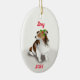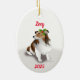 Brown Sable Sheltie with a green holly on the dog's head. You can personalize with your dog's name. Designed and Illustrated by ©Jacqueline Schneider