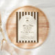 Birthday invitation featuring a hand-drawn coffee martini glass and coffee beans paired with elegant script and serif fonts in which your personalized information is written. The background is brown stripes on a light background. Check out our store for more items from this collection.