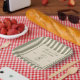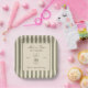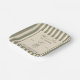 Birthday paper plate featuring a hand-drawn coffee martini glass and coffee beans paired with elegant script and serif fonts in which your personalized information is written. The background is brown stripes on a light background. Check out our store for more items from this collection.