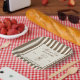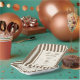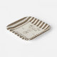 Birthday paper plate featuring a hand-drawn coffee martini glass and coffee beans paired with elegant script and serif fonts in which your personalized information is written. The background is brown stripes on a light background. Check out our store for more items from this collection.
