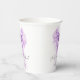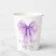 Elegant paper cups for her bridal shower that feature a purple bow watercolor, "she's tying the knot" showcased in a chic calligraphy script, and the bride's name and the shower date in simple modern lettering.