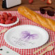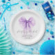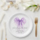 Elegant paper plates for your bridal shower featuring a purple bow watercolor, "she's tying the knot" showcased in a chic calligraphy script, and the bride's name and the shower date in simple lettering.