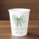 Elegant paper cupps for her bridal shower that feature a sage green bow watercolor, "she's tying the knot" in a chic calligraphy script, and the bride's name and the shower date in simple modern lettering.