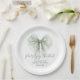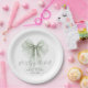 Elegant paper plates for your bridal shower featuring a delicate sage green bow watercolor, "she's tying the knot" showcased in a chic script, and the bride's name and the shower date in simple modern lettering.