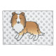 Desteis originelle Cartoon-Illustration eines niedlichen Shetland Sheepdog-Hundes in Einmalfarbe. Der Hintergrund weist ein Muster grauer Hundepfoten auf.